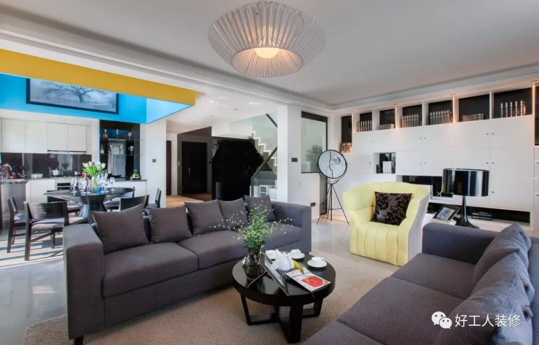 大胆运用色彩的现代前卫风,十分凸显个性,突破以往惯有的横平竖直的室内空间造型,将抽象图案与曲面、直线和波形曲线想结合,营造独特效果。
